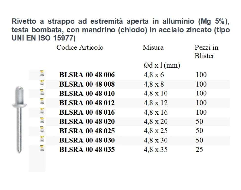 Conformità alle norme: Questo rivetto è conforme alle norme UNI EN ISO 15977, garantendo standard di qualità elevati.