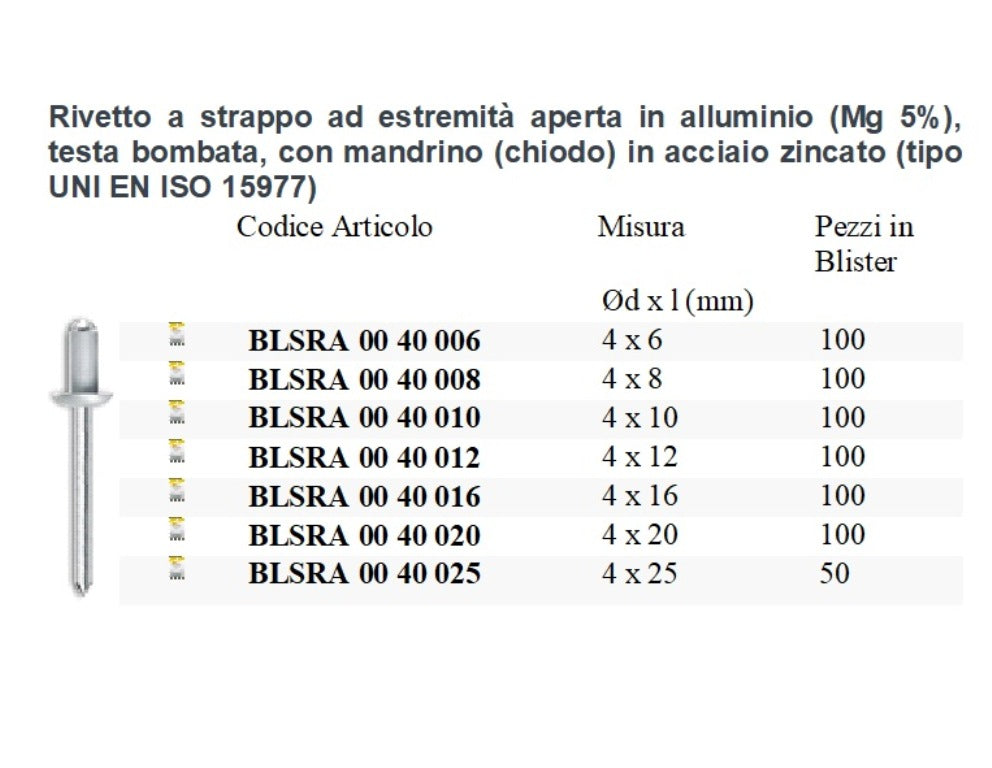 Conformità alle norme: Questo rivetto è conforme alle norme UNI EN ISO 15977, garantendo standard di qualità elevati.