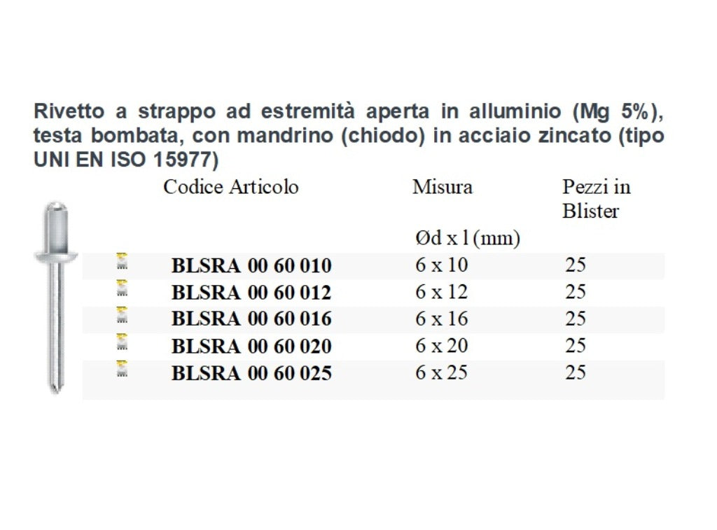 Conformità alle norme: Questo rivetto è conforme alle norme UNI EN ISO 15977, garantendo standard di qualità elevati.