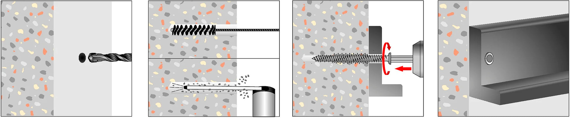 Applicazioni tipiche – Profili metallici, staffe, telai, guide, battenti, piastre e accessori impiantistici su calcestruzzo pieno o calcestruzzo aerato.