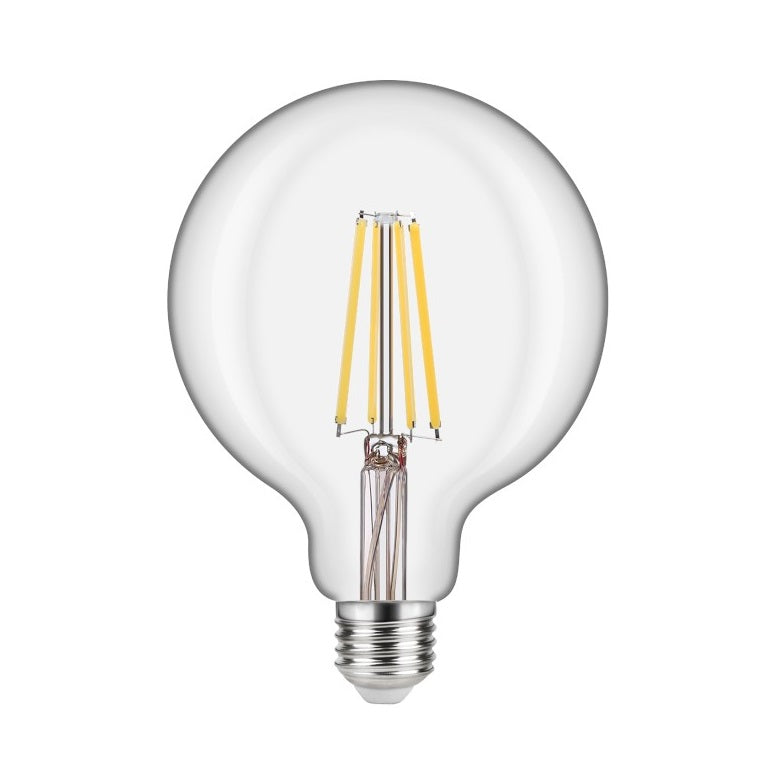 Lampadina con tecnologia LED Filament e forma Globo G125 in vetro trasparente. Fascio luminoso di 360° e flusso luminoso di 1500 lm.